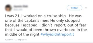 I noticed that several #metoo and #whyididntreportit tweets involved women (and at least one man) who stated that they were sexually abused on cruise ships, either as a passenger or as a crew member. All these individuals were publicly disclosing the incidents for the first time in their lives. All the incidents occurred many years ago, with some of the sexual assaults occurring as long as three to four decades ago.