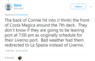 We were subsequently informed via Twitter that once the mooring lines broke, the Constellation struck the Costa Magica which was also in port in La Spezia.