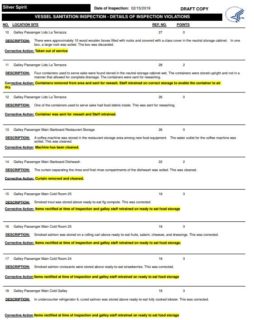 In the lengthy report, inspectors found numerous sanitation violations, including: potable water bunkering and calibration problems; inaccurate pipe disinfection logs; soiled backflow prevention devices, dishwasher nozzles, rinsing arms and manifolds and drain lines which were blocked with food debris; numerous fish products which were improperly stored with fruits, salami and cheese; improper time control plans in the officer/staff mess and passenger buffets; improper hand-washing temperatures/procedures/facilities (absence of soap); a small, broken and heavily soiled refrigerator was located in the engine room office area with a rotten apple and spoiled milk inside; and failure to follow protocols regarding acute gastrointestinal (AGE) involving a crew member who reported late to the crew medical facility, amongst other violations .