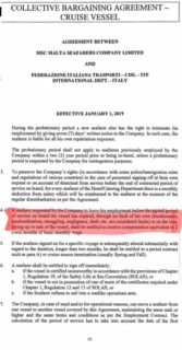 Pursuant to the terms and condition of the collective bargaining agreement (CBA)(photo below left), crew members are contractually entitled to two (2) months of their basic wages unless they have engaged in “drunkenness, insubordination, smuggling, theft” or other faults which are obviously inapplicable here. So if MSC was really concerned with their crew members’ safety and health, they would repatriate their employees and would pay them at least the minimum payments required under the employees’ collective bargaining agreement. Ideally they should be paid for as long as they remain out of work.