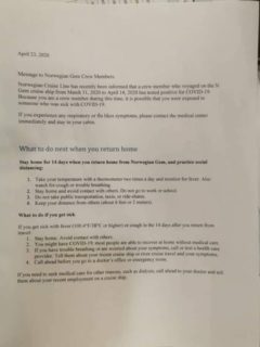 exposed to someone who was sick with COVID-19.” The letter continues stating that crew members who arrive home should practice social distancing for 14 days.