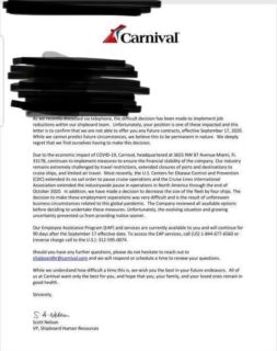 Today, several crew members provided internal documentation indicating that Carnival is sending as many as 7,000 termination letters to Carnival officers and crew members. As many as eight captains (masters), five staff captains, five guest service managers, six executive chefs and six hotel directors are among the top ship employees who are being laid off. Carnival sent these letters via e-mails to officers and crew members who are at home on vacation or otherwise at home awaiting a vessel assignment if and when the CDC permits cruising from U.S. ports. Carnival plans to make individual calls to follow up on some of the notices of termination.