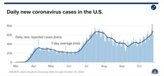The CDC’s warning comes at a time when there is a surge in the U.S., as well as in Europe, of new COVID-19 cases. This weekend, the U.S. reported more than 83,000 coronavirus cases two days in a row (Friday and Saturday) with a record seven day average of over 68,000, according to Johns Hopkins University