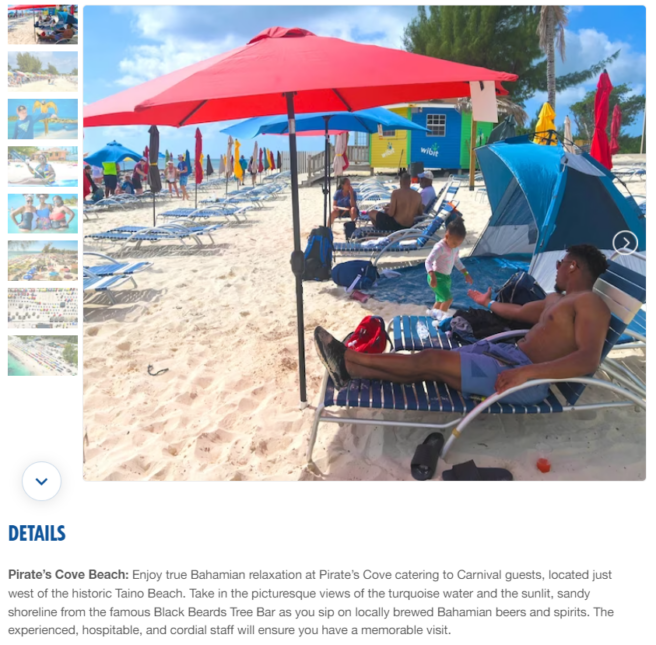 Above: a portion of Carnival Cruise Line’s promotional information selling excursions to Pirate’s Cove before the cruise line scrubbed it from its website.