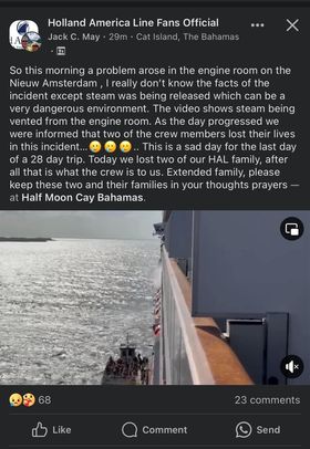A HAL fan page contained an image of steam being vented from the engine room of the HAL cruise ship