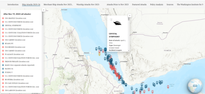 Image credit: Map of attacks – HAARETZ; La Champlain – Ponant Cruises; Crystal Symphony – Bahnfrend – CC BY-SA 4.0, commons / wikimedia; Galaxy Leader – Mail Online; data and map image of Houthi attacks on Crystal Symphony and commercial vessels – the United Kingdom Maritime Trade Operations (UKMTO) and NoamRaydan, a senior fellow at the Washington Institute.